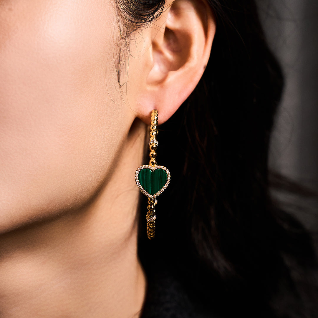 Featuring natural malachite set within brass and finished with 18k gold plating, the Love Heart Jewellery collection captures the vibrant beauty of this rare stone. Its distinctive green patterns bring a touch of individuality and sophistication, perfectly complementing the spirit of love and connection.