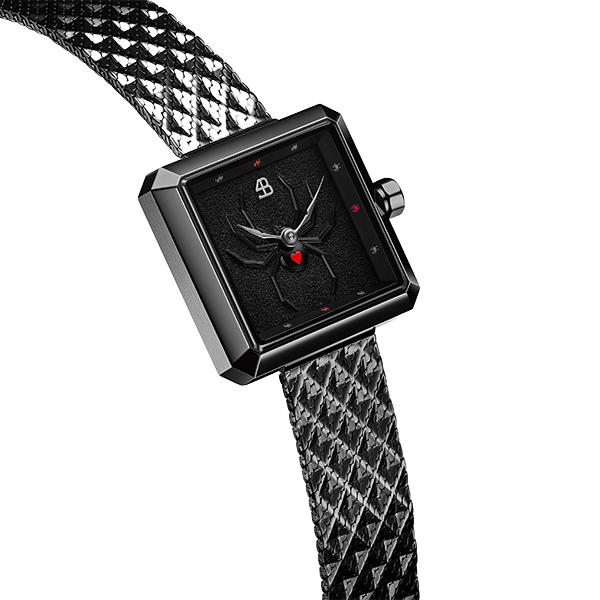 Black Spider dial, The dial is highlighted by a black spider emblem, the iconic 4B logo at 12 o’clock, and red spider markers at 3, 6, 9, and 12.